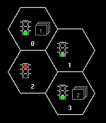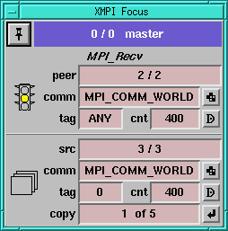After interacting with XMPI to run an MPI application, a honeycomb representation of all processes is displayed in the main (overview) window. Icons inside each cell indicate the execution state of the process and alert the user to any unreceived messages. Processes are identified by their rank in MPI_COMM_WORLD. A button click updates the information across the entire application - while the application is running (or perhaps deadlocked or otherwise hung). This simple capability to inspect, at runtime, the synchronization state of processes and messages is a very effective debugging tool. Source code steppers and "printf" are often used to get at the same information, but in a more cumbersome manner.