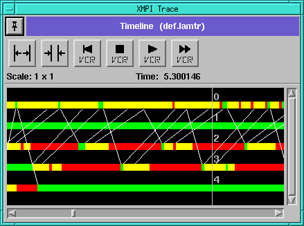 XMPI can cause the communication activity of an application to be traced. The resulting trace data can be extracted at runtime or after the application completes. The trace data is visualized in two tried and true ways: the communication timeline and the kiviat radial chart. Within XMPI however, these common views are highly intergrated into the overall debugging picture. Using a dial in the timeline window, a snapshot of the application state can be taken as if the same snapshot was taken at the selected time during the application's run. The results are displayed in the same manner, using the overview window and the processes windows.