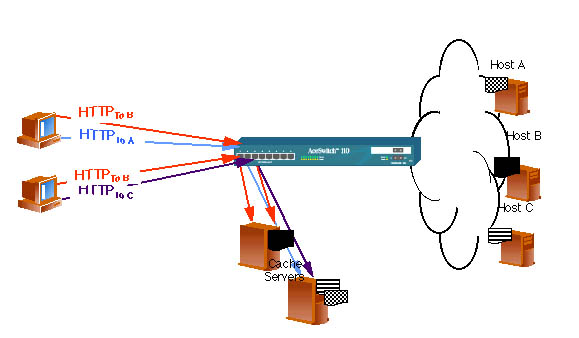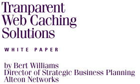 6) Summary Web caching provides valuable benefits to end users, enterprises and ISPs. A true win-win situation, caching can increase user satisfaction by improving response times while lowering WAN bandwidth requirements and costs for enterprises and ISPs. A variety of caching options exist in the market today. Under most circumstances, transparent proxy caching, used in conjunction with Web cache redirection, offer significant advantages over other solutions. It requires no administration of caches or browsers, offers the highest level of performance by offloading network functions from the cache and supporting user access to multiple caches and offers high availability with no single point of failure. Alteon Networks' server switching products, the ACEdirector, ACEswitch 180 and ACEswitch 110 offer high-performance Web cache redirection. By coupling Alteon's Web cache redirection with caches from leading vendors such as CacheFlow, Inktomi, Mirror Image and Network Appliance, users can build complete Web caching solutions. |