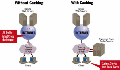 1) Why Web Caching? The World Wide Web's rapid growth, coupled with the increased use of Web technology in corporate intranets, has ushered in a new era of network computing. While the pundits talk about e-commerce, virtual communities and the digital nervous system, the true hallmarks of this era are unprecedented levels of user frustration and ever-increasing WAN costs. Why? Because the Web's underlying infrastructure was not designed to support the demands now being placed on it. While this situation is bad enough, the truth is that it's going to get worse before it gets better. As corporate users get faster LAN connections to their desktops and branch office and home users deploy faster access technologies such as 56K modems, cable modems, ISDN and xDSL, they will expect faster and faster responses from the Web and intranets. These expectations will be dashed if slow WANs and congested servers lie at the other end of users' high-speed access links. True, enterprises and service providers are deploying faster WANs and larger servers. However, this is expensive and is only a band-aid until users once-again overrun the capacity of the infrastructure and the cycle repeats itself. At some point, in the face of seemingly limitless user demand, diminishing returns come into play and the network simply collapses under its own weight. Further, fixed capacity investments are of limited value in a world where users flock to a Web site hosting the latest honeymoon video from a rock star and his actress wife one day and to different site hosting the latest Mars exploration pictures the next. Clearly, a new architecture is needed, one that is flexible, doesn't require constant server and bandwidth upgrades, is inexpensive to deploy and maintain and easy to administer. No matter what its final form, a key element in this architecture will be implementing a distributed system that stores frequently accessed content close to users. Storing data close to users is what Web caching is all about. Web caching improves user response time in several ways. First, as shown in Figure 1, below, it allows users to access Web pages while minimizing the WAN traffic needed to access those pages. For corporate intranet users, this means caching content on their site's LAN so that pages don't have to be retrieved across a private WAN. For World Wide Web users, this means storing content at their ISP's POP so that pages don't have to be retrieved across the Internet backbone. In both cases, not only does the user get better service in the form of faster responses but also the enterprise or ISP benefits from lower WAN costs. Second, Web caching, in effect, implements a distributed processing system, increasing the aggregate processing power available to popular Web pages by storing them on many servers. More aggregate processing power for a Web page translates into faster responses for users accessing the page. Third, Web caching effectively allocates processing power to the content that most needs it at that time. The more popular the content, the more likely it will be in cache. So if everyone want to see videos of rock stars and actresses one day and pictures of Mars the next, caching systems, by their very nature, accommodate this usage pattern. ![]() 2) The Ideal Caching System What characteristics would the ideal caching solution have? Among them would be: 1) 100% hit