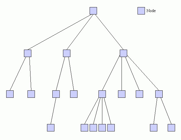 So, now let us follow a query through the tree network shown in Figure 4. One node originates the query. By assumption, the query is always sent up to the host node. The query is then tested against the bitmasks for each of the connected nodes/branches. If they pass, then the query is forwarded. Otherwise, nothing is sent. The host node receives the query and also forwards it up it its host. It then tests the query against bitmasks of its connected nodes/branches and forwards the query as needed. On average, only a small fraction of the nodes/branches will pass this culling procedure, so only a handful of queries will be forwarded. Only those nodes lying on branches which potentially can satisfy the query will receive it. The rest are left alone.