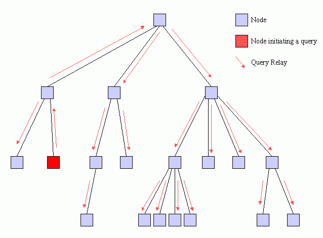 Figure 2 illustrates the normal query process. The query originates at a node and is forwarded up to its host. The host uplinks the query and forwards it down to other nodes that it is hosting. The process continues recursively until the entire network receives a copy of the query.