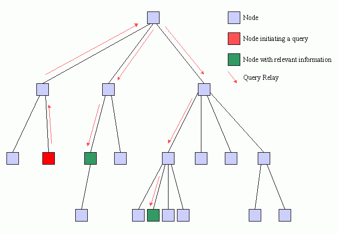 Of course, for an optimal query path to evolve, every node would need to know the complete contents of all of its connected nodes. Collecting, updating, and searching all of the information in all connected nodes and branches would be a significant burden on all of the nodes in the network. The dynamic nature of the network and the data it contains makes this approach unrealistic. Furthermore, if each node possessed complete information for all nodes, then any node could complete the query itself. In a sense, Gnutella's Reflector application [3] does this for a selected subnet. It does process queries on behalf of its nodes and so insulates those nodes from the bulk of query traffic. In essence, the Reflector builds a network segment which allows nodes on low-speed connections to participate in the network. Though this is an admirable advance, it fails to address the scaling issue for the network as a whole. The system running the Reflector is still subject to bandwidth limitations as it must process every query on the network. The bandwidth B in our previous equation goes a bit higher and hence the total number of queries on the network can be a bit higher before the network begins to come apart. But, therein still lies an inherent scaling limitation for the network. As the network grows and system-wide query rates increase, eventually bandwidth on the Reflector nodes will be insufficient and the network will fragment.
