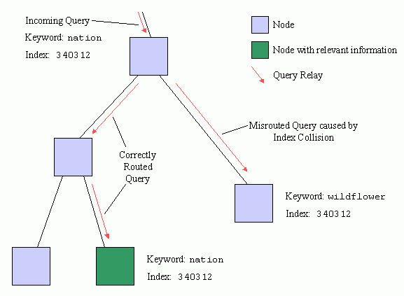 Figure 5 shows the diagram of collision-induced query misroute. The incoming search contains the keyword nation which has a hash index of 340312. The host node properly routes the query to the left branch and the query is satisfied. However, a misroute occurs when it also sends the query to the right. That node does contain index 340312, but this hash arises from the keyword wildflower. Ultimately, this node is not able to satisfy the query even though the hash indices match.
