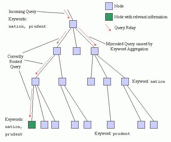 Figure 6 illustrates a misrouted query arising from keyword aggregation. The incoming query contains two keywords: nation and prudent. Again, the query is correctly routed to the left branch and trickles down to a node that contains both keywords. The query is incorrectly routed to the right branch because the aggregate bitmask contains the indices for both keywords. Each keyword is present on separate nodes in the branch. The query only progresses down one level into the branch before the keyword split occurs. The keyword nation is contained in the sub-branch to the right while the keyword prudent is contained in the sub-branch to the left. The query is not routed further.