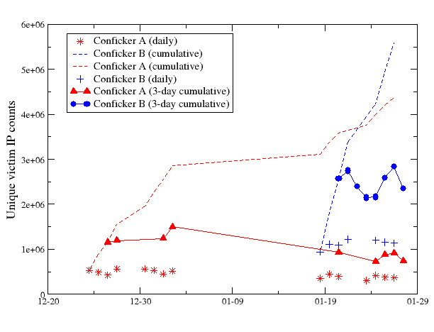 Total Count: Total IP Addresses Infection Count for Conficker A and B Conficker.A: IP Addresses Infection Count for Conficker A only Conficker.B: IP Addresses Infection Count for Conficker B only Q-Cumm A: Cumulative Q(*) values for Conficker.A Q-Cumm A: Cumulative Q(*) values for Conficker.B * - Q reports the number of machines that each victim claims to have infected. Q may be artificially inflated by reinfections and DHCP effects.. |