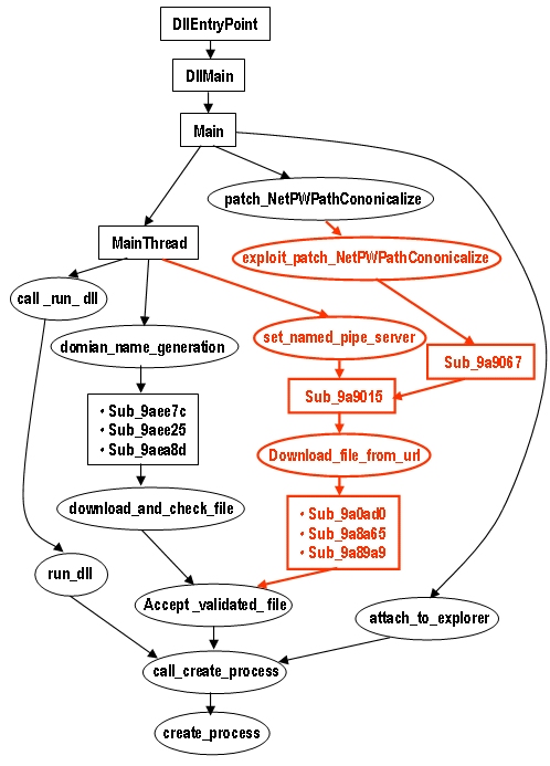 added. The overall logic restructuring and extensions for Conficker B++ are illustrated in Figure 9. Among the changes observed, we found a restructuring of the main function and introduction of two new paths leading to the CreateProcess API. The first path connects "patch_NetpwPathCanonicalize" to "call_create_process" through "download_file_from_url" and "accept_validated_file". The second path involves the addition of "set_name_pipeserver" which also leads to "download_file_from_url".