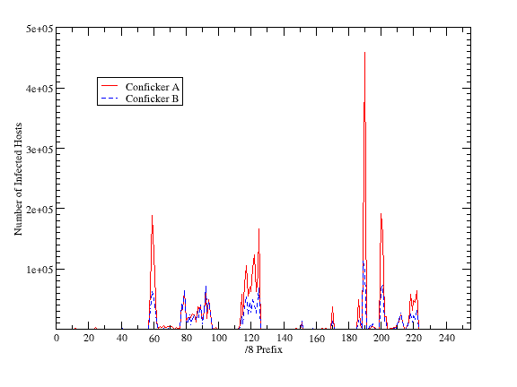 Figure 15 illustrates the distribution of victim IPs by their /8 network prefix. We find that the distributions for Conficker A and B are quite similar and few networks are responsible for a large fraction of infected hosts. We suspect that the vast majority of these networks are allocated to SOHO (small-office or home-office) networks, poorly managed enterprises, and countries with weak anti-piracy laws.