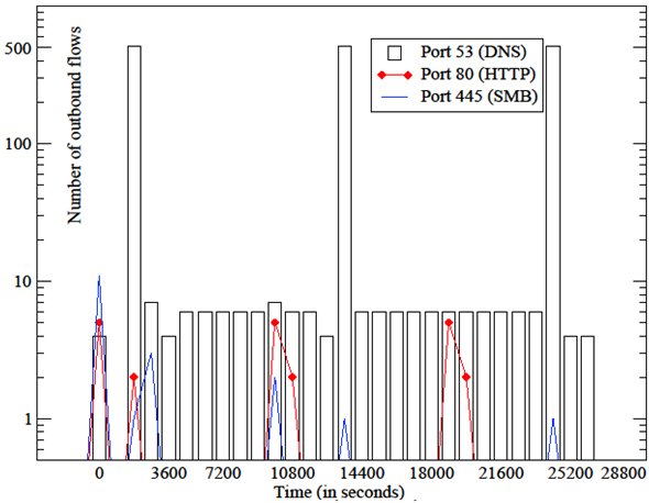 Network Impact: Figure 11 illustrates the post-infection network activity of a host infected with Conficker A. We see that activity is confined to three service ports: 53/UDP (DNS), 80/TCP (HTTP) and 445/TCP(SMB). The periodic spikes in DNS activity (every 3 hours) correspond to the Conficker rendezvous activity. The peaks are at 500 (not 250) because the Windows host attempts an additional DNS request lookup for <domain>.localdomain when the DNS A query for <domain> fails. The background DNS activity corresponds to repeated lookups for trafficconverter.biz (every 5 minutes). These results validate our findings from the static analysis. We find that there was very limited port 445/TCP activity. The host was behind a NAT (network address translation), but was able to determine its external facing IP address from checkip.dyndns.org.