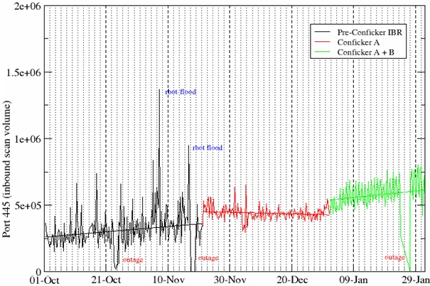 Honeynet Perspective: We begin by measuring the impact of Conficker A and B through a longitudinal study of TCP/445 activity on a /18 network segment in the SRI Honeynet as shown in Figure 12. The pre-Conficker A activity is shown in black, Conficker A volumes are shown in red and the post Conficker B activity (with A and B) is shown in green. We find several interesting trends. First, prior to Conficker A, the volume of inbound TCP/445 scans was bursty with an increasing trend. However, upon the emergence of Conficker A, much of the variability is removed and rbot activity seems to have largely disappeared. The volume of TCP/445 with Conficker A activity seems steady (with slight diurnal characteristics) suggesting that Conficker A attained its critical mass almost immediately (like most scan-and-infect worms). Finally, around December 31, Conficker B emerges, transforming the steady scan rate into a strongly diurnal signal with a noticeable uptick over time. We attribute this to the fact that Conficker B is more versatile than Conficker A and has additional propagation mechanisms such as USB drives which are affected by human interactions.