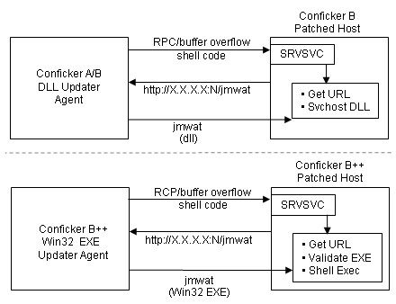 As is common among malware, Conficker incorporates facilities to close the vulnerability that it exploits once it takes ownership of its victim host. Specifically, Conficker provides an in-memory patch to the RPC vulnerability within the netapi32.dll NetpwPathCanonicalize function. However, while this patch protects the host from arbitrary RPC buffer overflow, it is specially crafted to allow other Conficker hosts to reinfect the victim, possibly as a second back door means by which it can install new binary logic into previously infected hosts. [12]. In Conficker A and B, this pseudo-patch parses incoming RPC requests in search of the standard Conficker shellcode exploit string. When this string is encountered, the Conficker-infected host will pull the designated DLL binary payload from the remote attacker, as specified in the URL embedded within the shellcode. The DLL is loaded using the svchost command, as specified in the shellcode. This process is illustrated in the top panel of Figure 10.Conficker B++ now extends and simplifies the buffer overflow, allowing a remote agent to provide a URL reference to a digitally signed Win32 exectuable. This Win32 executable is pulled by the Conficker B++ host, its digital signature is validated or rejected (see Binary Download and Validation), and if acceptable the Win32 binary is then directly spawned by the CreateProcess routine. This modification is shown in the bottom panel of Figure 10. Conficker B++ is no longer limited to reinfection by similarly structured Conficker DLLs, but can now be pushed new self-contained Win32 applications. These executables can infiltrate the host using methods that are not detected by the latest anti-Conficker security applications.