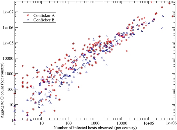Appendix 1 provides a cumulative summaries of IP counts and cumulative Q-counts for countries around the globe. We find that China dominates both infections. BR, IN, and AR also seem to suffer large numbers of infections. One reason for this might be unpatched systems that run pirated versions of Windows. We find that UA and RU are more significantly impacted by Conficker B suggesting that the protection mechanisms (keyboard layout check) built into Conficker A insulated certain Ukrainian and Russian systems.One of our objectives was to measure the degree to which Q-counts provide an estimate of the prevalence of Conficker. Figure 14 is a scatter plot of the per-country distribution of Q-counts and IP-counts. We find that except for a few outliers (such as CL and IN), countries with high IP counts have proportionately high Q-counts. Since Conficker increments the Q-count on each infection, one would expect the cumulative sum of Q-counts of all IPs to provide an accurate estimate of overall infections. This method (counting the highest Q-count per IP) has been proposed as a means to obtain overall infection counts for Conficker B [1]. However, we find that simply adding cumulative Q-counts provides vastly inflated numbers. Simply counting the top seven countries provides over 27 million infections. Potential reasons for discrepancy could include machines being cleaned up, or certain Q-counts being double counted because of DHCP effects. But a recent analysis leads us to a better explanation [12]. Chien describes Conficker's secondary payload distribution mechanism, i.e., Conficker patches MS08-067 exploit in such a way that reexploitation is allowed so long as the shell code matches Conficker's payload. This implies that Q-counts would get incremented during repeated exploitation of systems, suggesting a potentially fundamental flaw in F-secure's analysis [1].