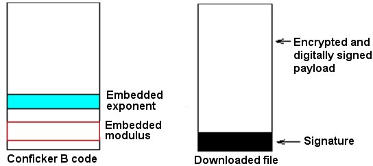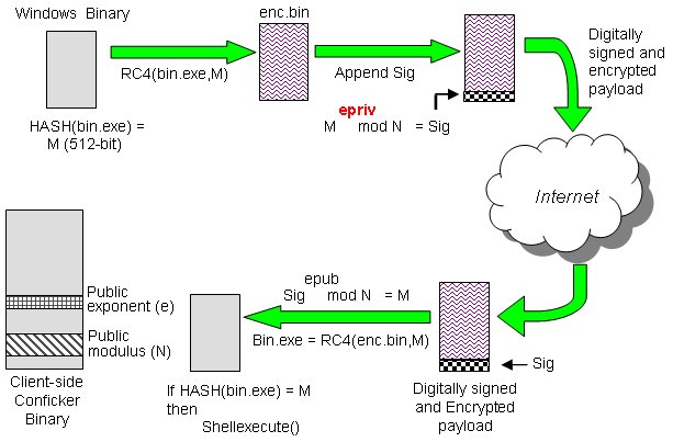 The pipe name ("System_<computername>7") is passed to the CreateNamedPipe API, which creates a bi-directional pipe where both the server and clients can write and read streams of messages limited to 0x400 bytes. The recurrent choice of constant number 7 here is interesting. Previously, it was used as part of the HTTP rendezvous query in Conficker A and as part of a mutex name. Since the name is not random, any external host or a local process can connect to this pipe and upload a binary. This is easily accomplished through an SMB (TCP/445) connection to the specified pipe. The code repeatedly calls CreateNamedPipe in a loop. If the pipe has been successfully created, then a read from the pipe is attempted. The code reads 0x400 bytes and if the buffer is null-terminated it passes the message to the function "thread_download_file_from_url". The message is interpreted as a string representing a URL that is used to download an executable. This binary is validated using the signature check and RC4 decryption routines before being executed using CreateProcess.