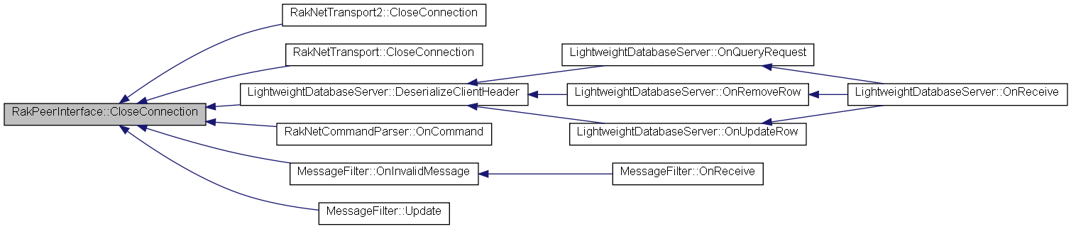 virtual void | CloseConnection (const SystemAddress target, bool sendDisconnectionNotification, unsigned char orderingChannel=0, PacketPriority disconnectionNotificationPriority=LOW_PRIORITY)=0 |